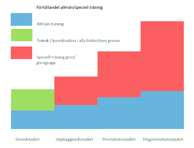 Vi har tidigare skrivit om riskerna med för tidig specialisering. Träningsläran förordar en varierad och mångsidig träning och balansen mellan allmän och speciell träning i de olika utvecklingsstadierna visas i figuren nedan (”principen om mångsidighet”). Notera att varje stadium innehåller både allmän som speciell träning men där förhållandet mellan de två blir större ju närmare högprestationsstadiet vi kommer medan en större del av träningstiden i grundstadiet bör innehålla allmän träning.