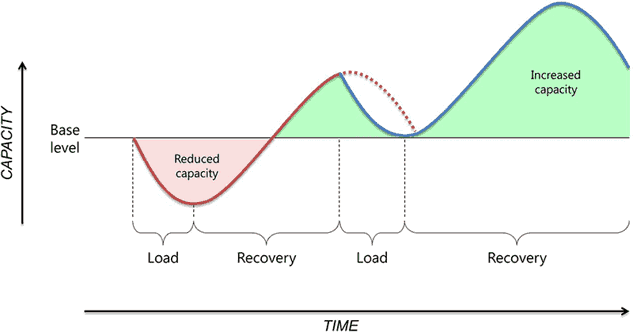 Figur 1. Y-axelns ”capacity” kan översättas till den enskilda idrottarens ”prestationsförmåga” och X-axeln visar tid som kan vara en vecka eller över en längre tidsperiod. Y-axeln visar att vid träning (load) bryts kroppen ned för att sedan efter en bra återhämtning (recovery) bygga upp kroppens vävnader igen. Återhämtning kan vara flera olika saker, inom ungdomsidrott är de viktigaste sömn och kost men det är även viktigt att exempelvis fötter och knän som växer får en ”återhämtning” från upprepade likartade belastningar.