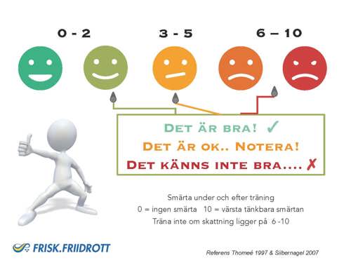 Skalan går även att använda i träningsgruppen som ett redskap för att hjälpa ungdomar att lära sig tolka sina egna upplevelser av smärta och relatera det till träning (Skillington 2017). Det kan exempelvis vara någon som har en ”känning” i ett knä under träning, be hen skatta eventuell smärta under träningen och sedan fråga vid nästa träningstillfälle hur det kändes dagen efter. Även i träning bör upplevd smärta (”känning”) som skattas ligga mellan 0-2 anses som ok och mellan 3-5 anses som acceptabel men den bör inte överstiga 5.