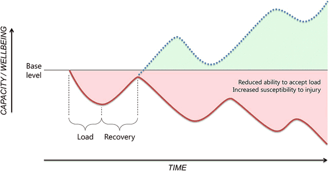 Figur 2. På Y-axeln visas idrottarens prestationsförmåga kopplad med välmående. Om återhämtningen blir otillräcklig blir vävnaderna (muskler, senor, skelett) mer och mer känsliga för belastning och risken ökar att idrottaren ska bli skadad.