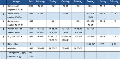 *Fredagar kl 15.30-19 är företrädelsevis avsedda för barn upp t o m 12 år (födda 2014 eller senare). Notera att tiden även, enligt samråd, är upplåten för ungdomar (kategori 5) samt ungdomar/juniorer/seniorer (kategori 1).