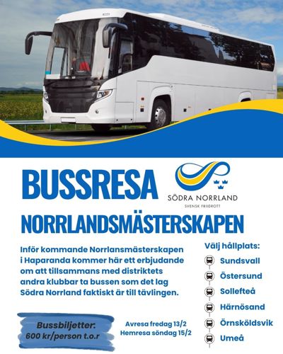 Inför den kommande tävlingen i Haparanda helgen 14-15 februari, erbjuder Södra Norrland föreningarna att som lag, ta bussen.