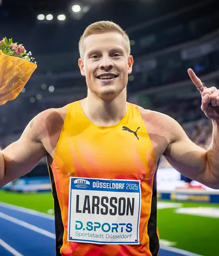 Efter att varit nära sitt personbästat och distriktsrekordet för Södra Svealand på 60 meter, så åkte Henrik Larsson från IF Göta från tyska Düsseldorf med meriterande seger med tiden 6,54.
