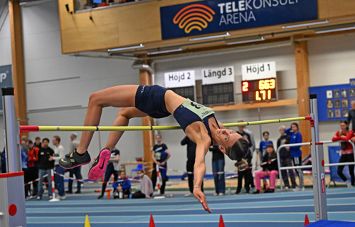 Fyra tjejer var kvar när ribban höjdes till 1.71 och där det bara var en som klarade höjden. Det var KFUM Örebros Svea Victorén och det blev också hennes segerhöjd i damernas seniorklass. Men Svea var inte riktigt kompis med ribbpassagen denna dag och det syntes att det fanns mycket mer i hennes hopp. Så får hon bara ordning på det...