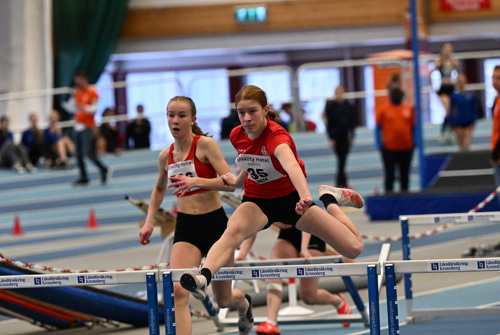 Snabbast i F15-klassens försök på 60 meter häck var Eslövs Juliette Debaecker (bilden nedan) med nya personliga rekordet 9.10. I semin persade hon på nytt med 9.07 för att sedan slå till med ännu ett PB i finalen, 8.99 vilket räckte till seger. Bakom guldmedaljören skilde det sedan bara en hundradel. SM-silvret gick till Ines Kraft, KA2 IF på nya personliga rekordet 9.08. Bronset till IF Göta Karlstads My Olsson som även hon persade med 9.09.